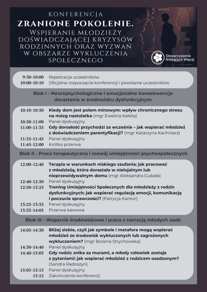Konferencja „Zranione pokolenie. Wspieranie młodzieży doświadczającej kryzysów rodzinnych oraz wyzwań w obszarze wykluczenia społecznego” to przestrzeń wymiany wiedzy, doświadczeń i inspiracji. Podczas spotkania pochylimy się nad kluczowymi zagadnieniami dotyczącymi wzmacniania młodych ludzi: budowania ich odporności psychicznej, relacji z dorosłymi, interwencji w sytuacjach kryzysowych, współpracy międzyinstytucjonalnej oraz tworzenia środowisk sprzyjających rozwojowi i dobrostanowi.