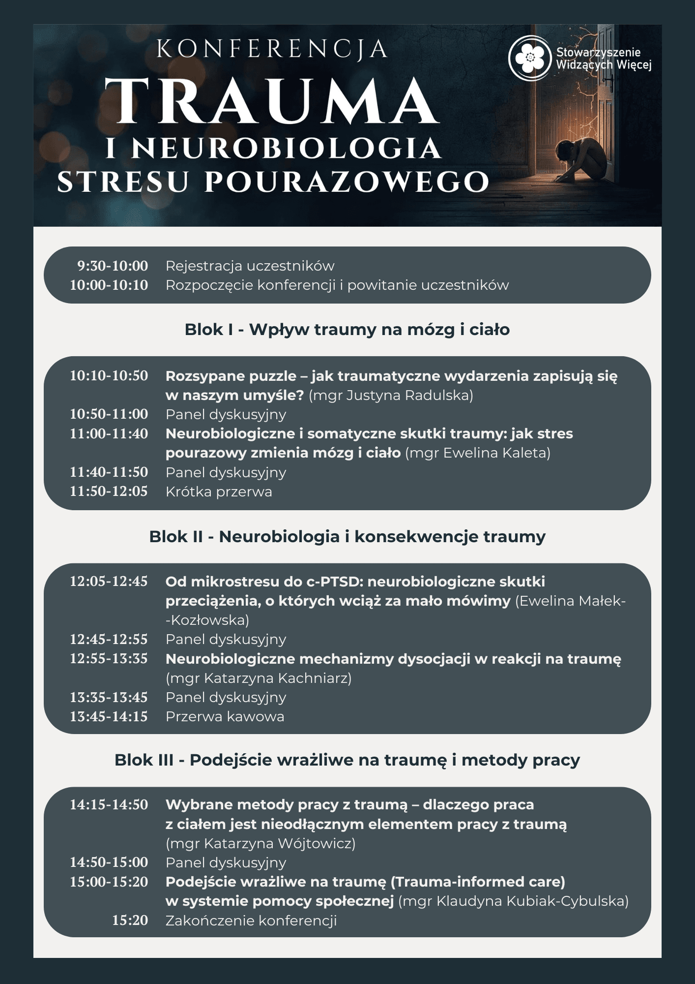 Zapraszamy do udziału w konferencji poświęconej zagadnieniom traumy i neurobiologii stresu pourazowego. Podczas spotkania specjaliści zdrowia psychicznego przedstawią aktualne badania, praktyczne podejścia terapeutyczne oraz strategie wsparcia osób po doświadczeniach traumatycznych.